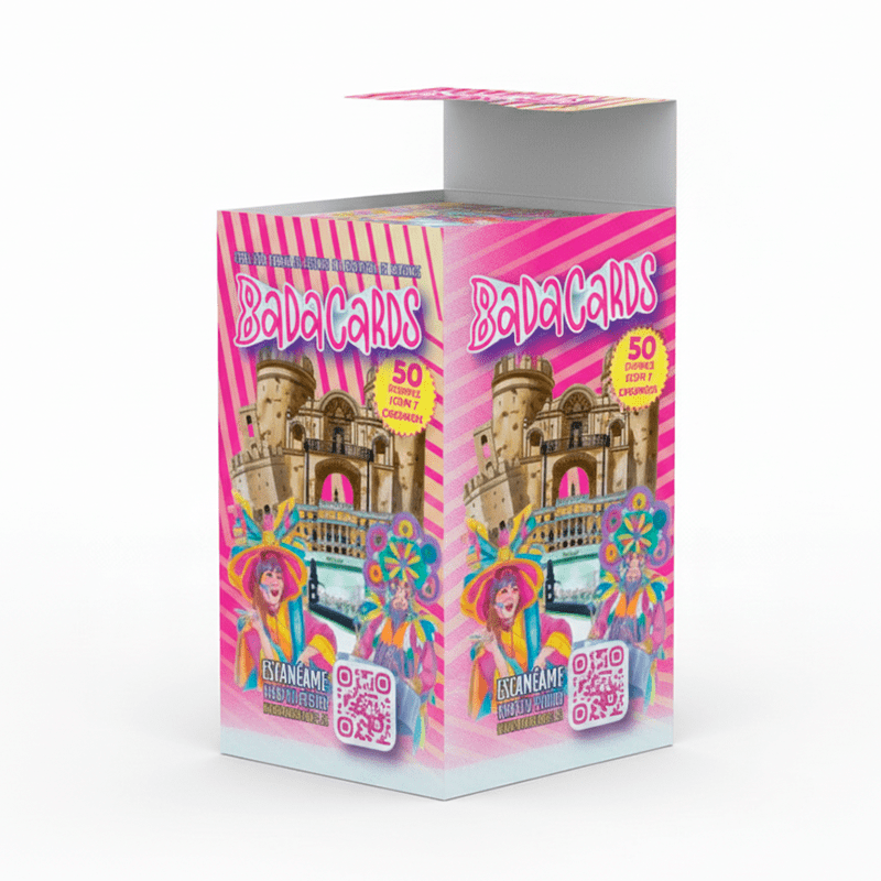 Incluye una caja de 50 sobres de BadaCards, los sobres de Badacards contienen 7 cromos de la colección oficial de cromos del Carnaval de Badajoz. Están disponibles en diferentes packs, que se venden por separado y se surtirán según la disponibilidad de existencias. Permitiendo a los coleccionistas ampliar su colección de cromos.
